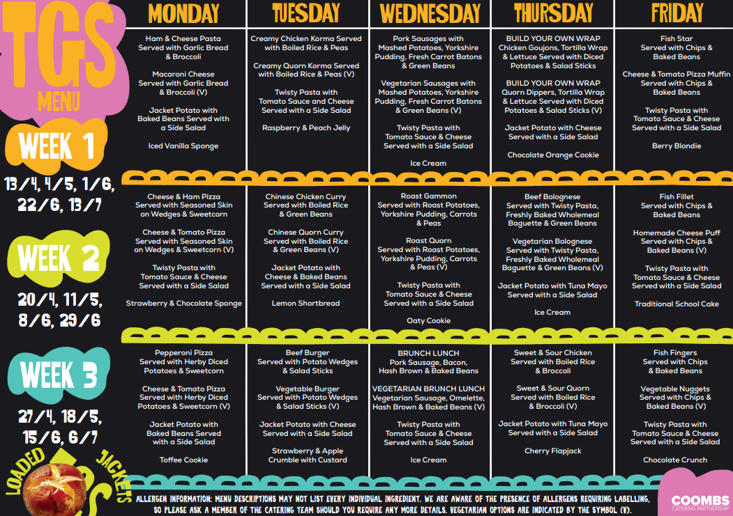As of September 2018 our school dinners are provided by Coombs Catering. They are ordered and paid for online.
